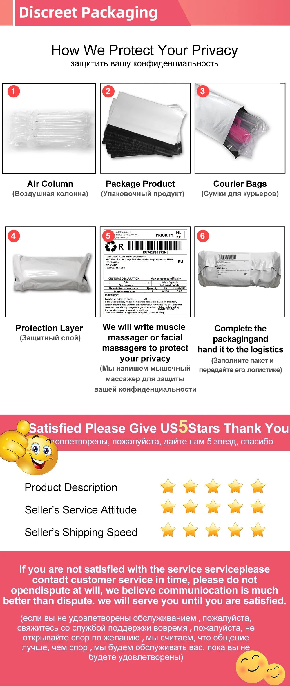 Your privacy is the utmost importance to us. We promise send your products in secret condition, the packaging without any pictures and words about sex.